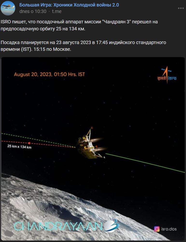 ISRO (India) píše, že pristávacie vozidlo misie Chandrayaan 3 sa presunulo na pred-pristávaciu obežnú dráhu s parametrami 25 x 134 km. Pristátie je naplánované na stredu 23.08.2023 o 17:45 indického štandardného času (IST). 15:15 hod MSK.