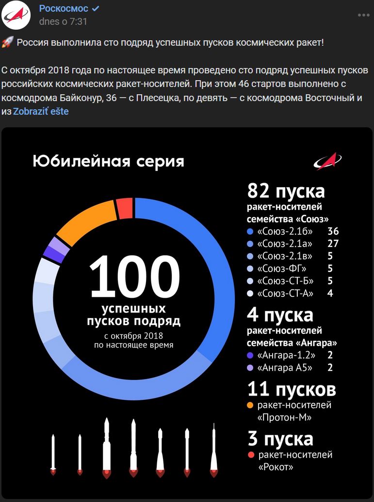 Od 10/2018 do 09.02.2023 sa uskutočnilo 100 úspešných štartov ruských vesmírnych rakiet za sebou. Z nich 46 bolo vypustených z Bajkonuru, 36 z Plesecka, po 9 z kozmodrómu Vostočnyj a z Guyanského vesmírneho centra. Medzi nimi bolo 82 štartov rakiet rodiny Sojuz, 11 štartov nosičov Proton-M, 4 štarty rakiet rodiny Angara a 3 štarty rakiet Rokot. V 06/2021 bol v novodobej ruskej histórii zaznamenaný národný rekord 60 úspešných štartov kozmických nosných rakiet za sebou. Predchádzajúci rekord bol 59 úspešných štartov za sebou od 02/1992 do 03/1993.