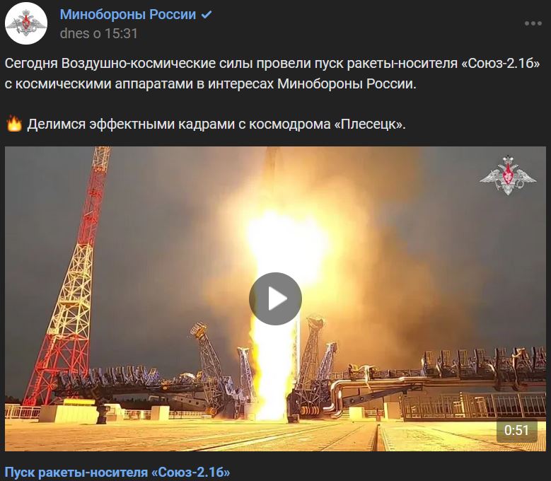 O 10:03 hod. zo Štátneho skúšobného kozmodrómu Ministerstva obrany Ruskej federácie (kozmodróm Pleseck) v Archangeľskej oblasti VKS vypustili ľahkú nosnú raketu Sojuz-2.1v s kozmickým aparátom pre Ministerstvo obrany Ruska.