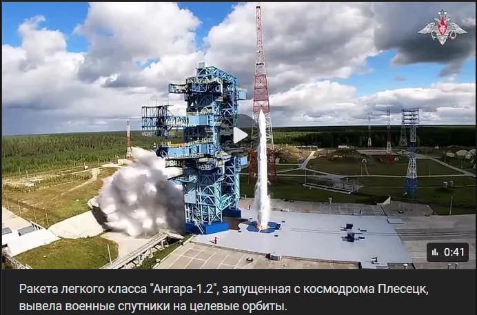 Video https://vk.com/video-123538639_456318221 dĺžka 41 sek.Nosná raketa ľahkej triedy „Angara-1.2“ (Ангара-1.2), vypustená z kozmodrómu Pleseck (Плесецк), vyniesla vojenské družice na cieľové obežné dráhy.