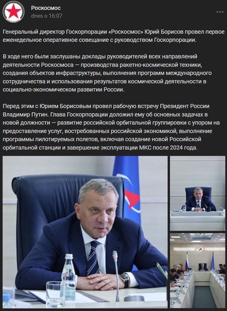 Generálny riaditeľ spoločnosti Roskosmos (Роскосмос) Jurij Borisov (Юрий Борисов) usporiadal prvé každo-týždňove operatívne stretnutie s vedením štátnej korporácie. Počas stretnutia boli informovaní vedúci všetkých oblastí činnosti Roskosmosu - výroba raketovej a vesmírnej techniky, vytváranie infraštruktúrnych zariadení, realizácia programov medzinárodnej spolupráce a využívanie výsledkov vesmírnych aktivít v sociálnom a ekonomickom rozvoji Ruska. Predtým sa uskutočnilo pracovné stretnutie ruského prezidenta Vladimira Putina s Jurijom Borisovom. Hlava štátnej korporácie ho informoval o hlavných úlohách v jeho novej funkcii - rozvoj ruskej orbitálnej skupiny so zameraním na poskytovanie služieb požadovaných ruským hospodárstvom, realizácia programu pilotovaných letov vrátane vybudovania novej ruskej orbitálnej stanice ROSS a ukončenie prevádzky MKS po roku 2024 (keď skončia teraz platné zmluvy - viď video ↑). Zdroj https://vk.com/wall-30315369_564339 z 26.07.2022 + 3 lepšie foto