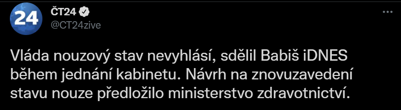 Vláda nouzový stav kvůli zhoršující se epidemické situaci v zemi nevyhlásí. Na dotaz ČTK to potvrdil premiér Andrej Babiš (ANO) během večerního jednání kabinetu. Znovuzavedení stavu nouze zvažovalo ministerstvo zdravotnictví. Důvodem byla situace v nemocnicích hlavně v moravských krajích, které čelí náporu pacientů s covidem-19. Vyhlášené opatření by umožnilo nařídit pracovní povinnost medikům. Podle informací několika členů vlády návrh ale nakonec nikdo oficiálně nepředložil. :lol:
