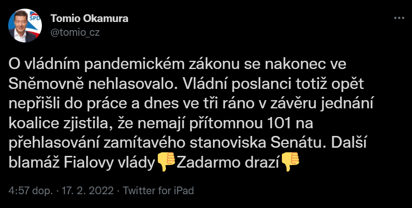 Tak na ten pandemický zákon spěchali, tak se rozčilovali nad Okamurovu obstrukcí až jich tam nebylo dost na hlasování tak to odložili na pátek.