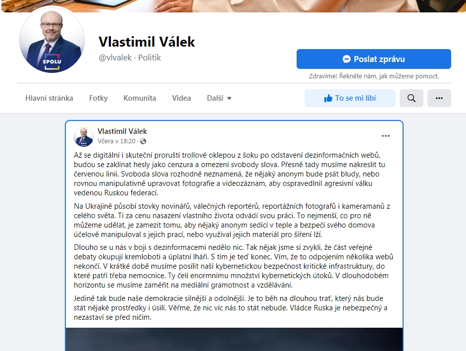 https://www.parlamentnilisty.cz/arena/m ... ede-694542„Je zapotřebí, aby česká vláda situaci s válkou na Ukrajině nezneužívala k tomu, aby cenzurovala vyjádření opozice,“ ohradil se poslanec Jaroslav Bašta.