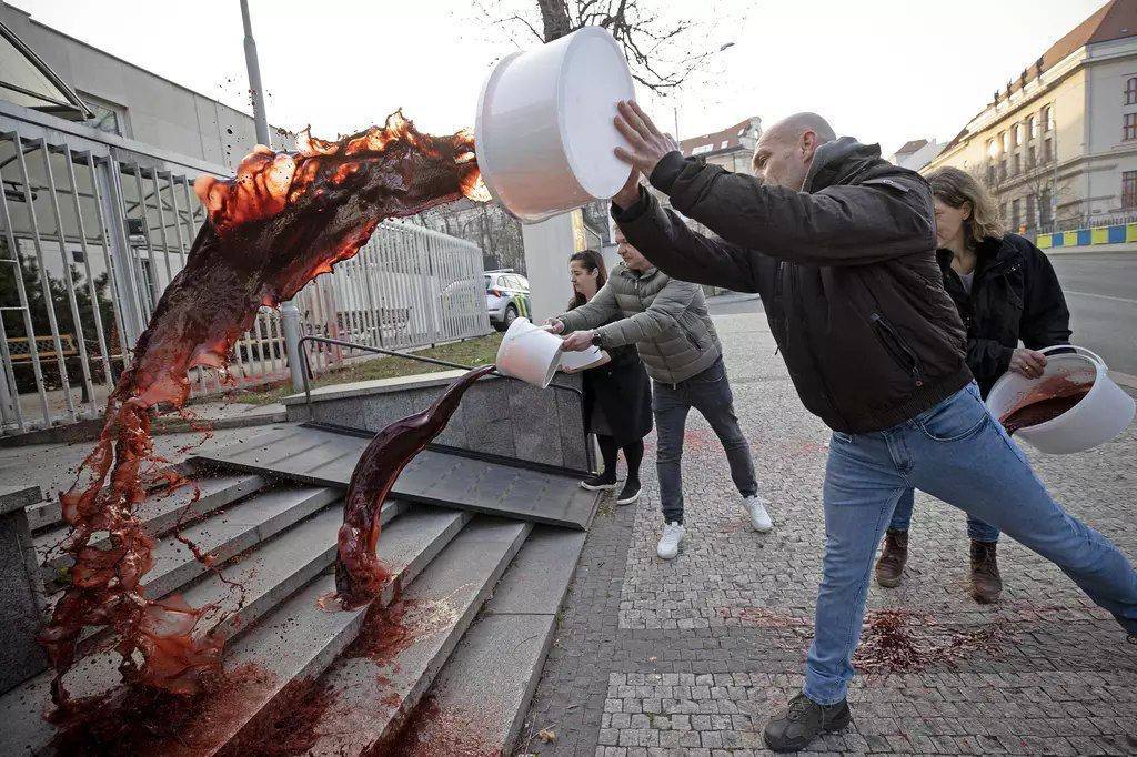 Ruské velvyslanectví v Praze bylo polito umělou krví