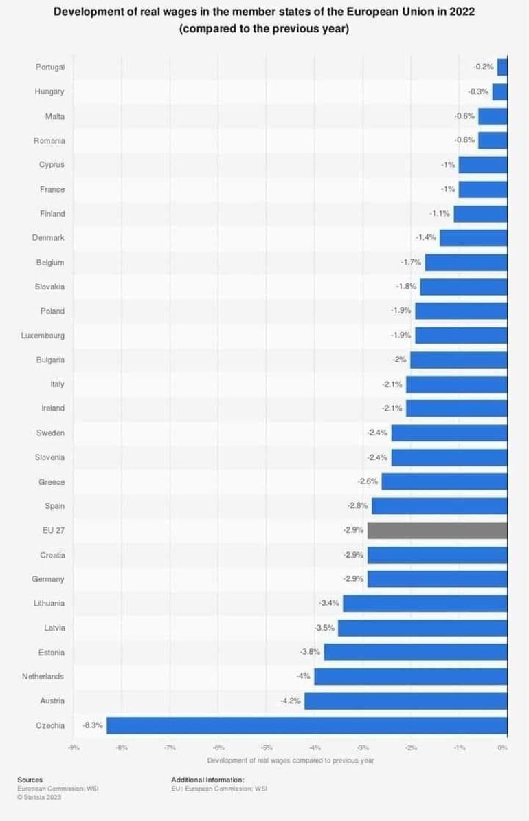 Po tom, co máme opět bezkonkurenčně nejméně oblíbeného premiéra široko daleko, tak máme aktuálně i největší pokles reálných mezd v celé širé EU. Před námi je i rozhazovačné Řecko, skoroválečná Litva, Lotyšsko a Estonsko, no prostě úplně všichni. Dvakrát horší, než ten nejhorší před námi. To je paráda ne?