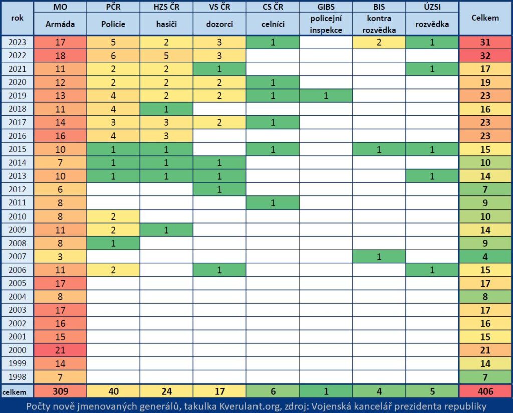 Do generálských hodností bylo mezi lety 1998 a 2023 jmenováno 309 vojáků, 40 policistů, deset příslušníků tajných služeb, 24 hasičů, šest celníků a 17 dozorců.