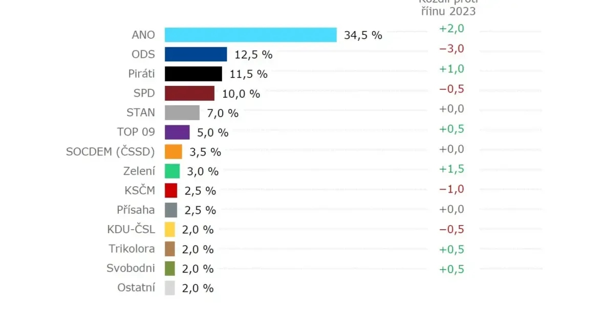 V listopadu by ANO získalo na 34,5 procenta, což je to o dva procentní body více než před měsícem. Druhá ODS by měla 12,5 procenta, tedy o tři procentní body méně než v říjnu. Tehdejší nárůst tak byl zřejmě jen výkyvem. Pokud by vládní strany ODS, TOP 09 a KDU-ČSL kandidovaly stejně jako v minulých volbách jako koalice Spolu, hlasovalo by pro ně 18,5 procenta voličů. ANO by i v tom případě dostalo 34,5 procenta hlasů.
