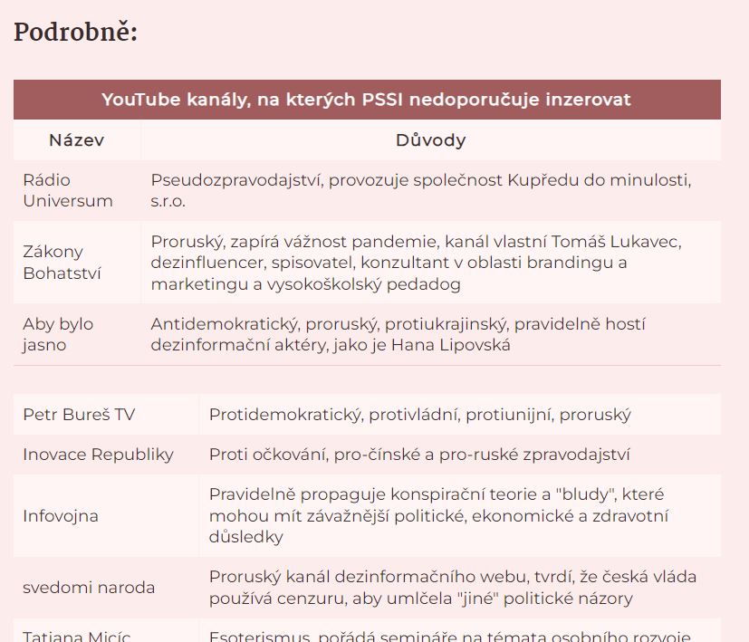 Matěj Nejedlý se zaštiťuje neziskovou, když ve svém článku zveřejňuje YouTube kanály, na kterých PSSI nedoporučuje inzerovat a uvádí důvody. Je to velmi různorodá směsice. Vedle lidí, ze kterých by měl psychiatr radost, zcela bezostyšně nálepkují aktivisté levicové i pravicové politické protivníky vlády a dokonce zvolené europoslance. A to už je moc.