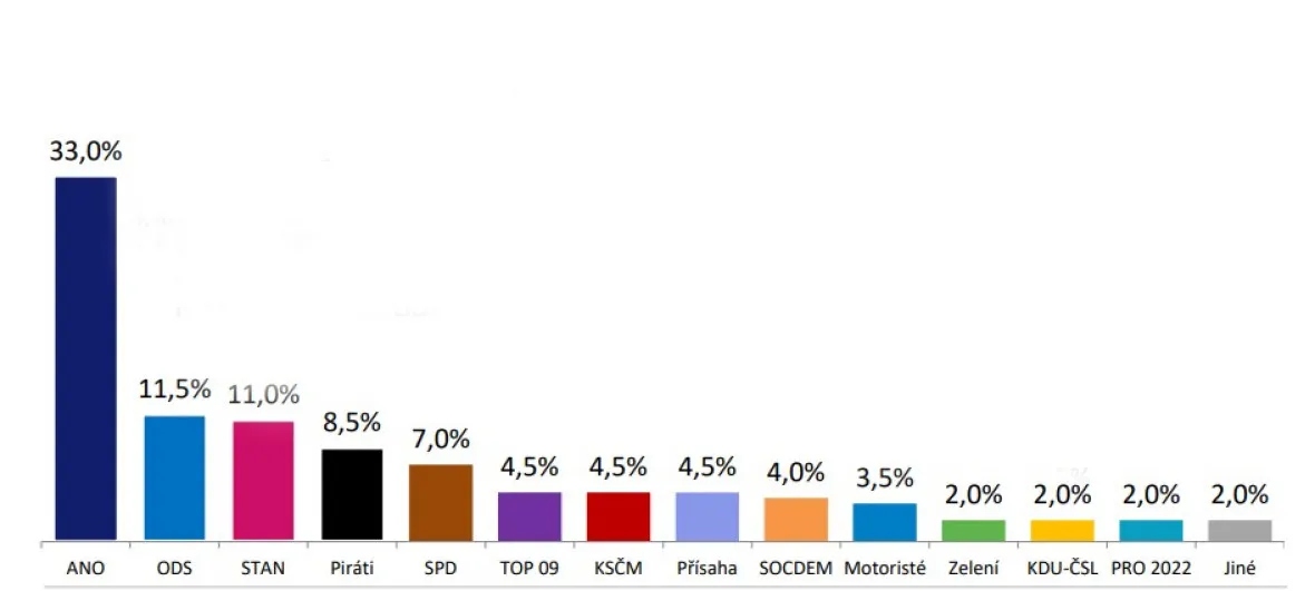 Volby do Sněmovny by v září vyhrálo se ziskem 33 procent hlasů opoziční hnutí ANO. Druhá ODS by získala 11,5 procenta a třetí hnutí STAN 11 procent, vyplývá z volebního modelu agentury Median. Do Sněmovny by se podle něj dostali ještě Piráti a SPD.