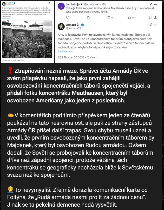 Zdroj https://t.me/neCT24/69418 z 28.01.2025Správci účtu Armády ČR ve svém příspěvku napsali, že jako první zahájili osvobozování koncentračních táborů spojenečtí vojáci, a přidali fotku koncentráku Mauthausen, který byl osvobozen Američany jako jeden z posledních.