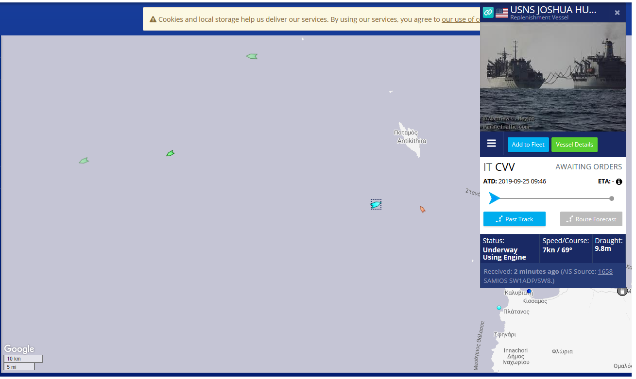 Podporná loď USNS Joshua Humphreys pri brehoch Kréty, v minulosti sa podieľala ako podpora na tzv. "protiteroristických" akciách. Možný smer Sýria alebo Čierne More
