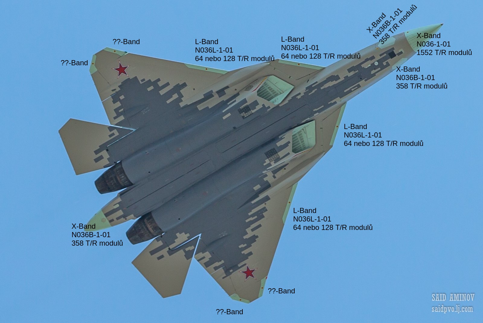 Hodně zajímavá fotka Su-57 z přehlídky v Moskvě - 12 radiačních symbolů na/u dielektrických krytů (celá anténní radarová soustava Š-121) - upozornění pro pozemní obsluhu na zdraví ohrožující ionizující záření pod napětím (na letounech se tak značí jen radarové antény se silným vyzařováním, dosud se tak označoval hlavně radar a nebo silné laserové značkovače).