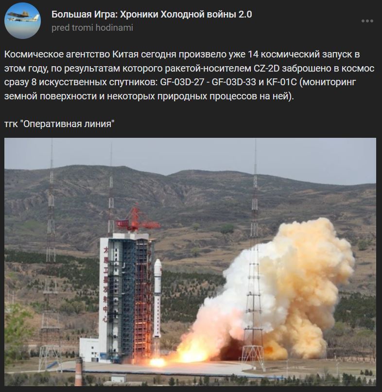 Čínska vesmírna agentúra vo štvrtok 05.05.2022 uskutočnila už 14. tohtoročný štart, pri ktorom na palube nosnej rakety CZ-2D vypustila 8 družíc: GF-03D-27 - GF-03D-33 a KF-01C (monitorovanie zemského povrchu a niektorých prírodných procesov na ňom)