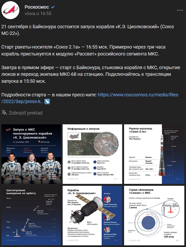 V stredu 21.09.2022 z Bajkonuru odštartovala kozmická loď K. E. Ciolkovskij (К.Э. Циолковский) = Sojuz MS-22 (Союз МС-22). Ciolkovskij mal nedávno okrúhle výročia. Štart nosnej rakety Sojuz 2.1a (Союз 2.1а) o 16:55 hod. MSK. Približne o 3 hodiny sa kozmická loď pripojí k modulu "Rassvet" (Рассвет) ruského segmentu MKS. Ide o posádku MKS-68 na stanici.