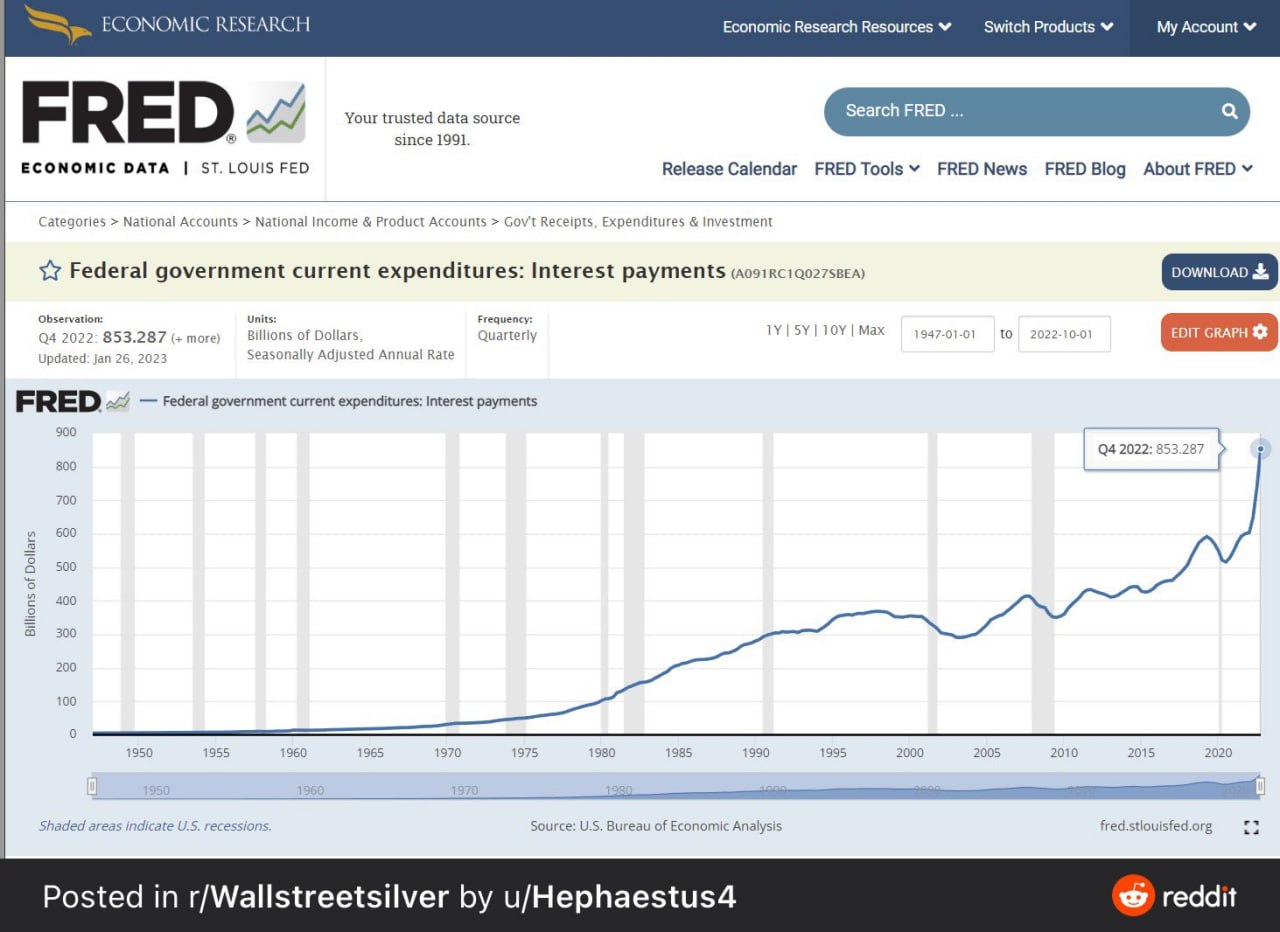 USA zaplatily v roce 2022 853 miliard dolarů na úrocích z dluhu ve výši 31 bilionů dolarů; více než rozpočet na obranu v roce 2023.