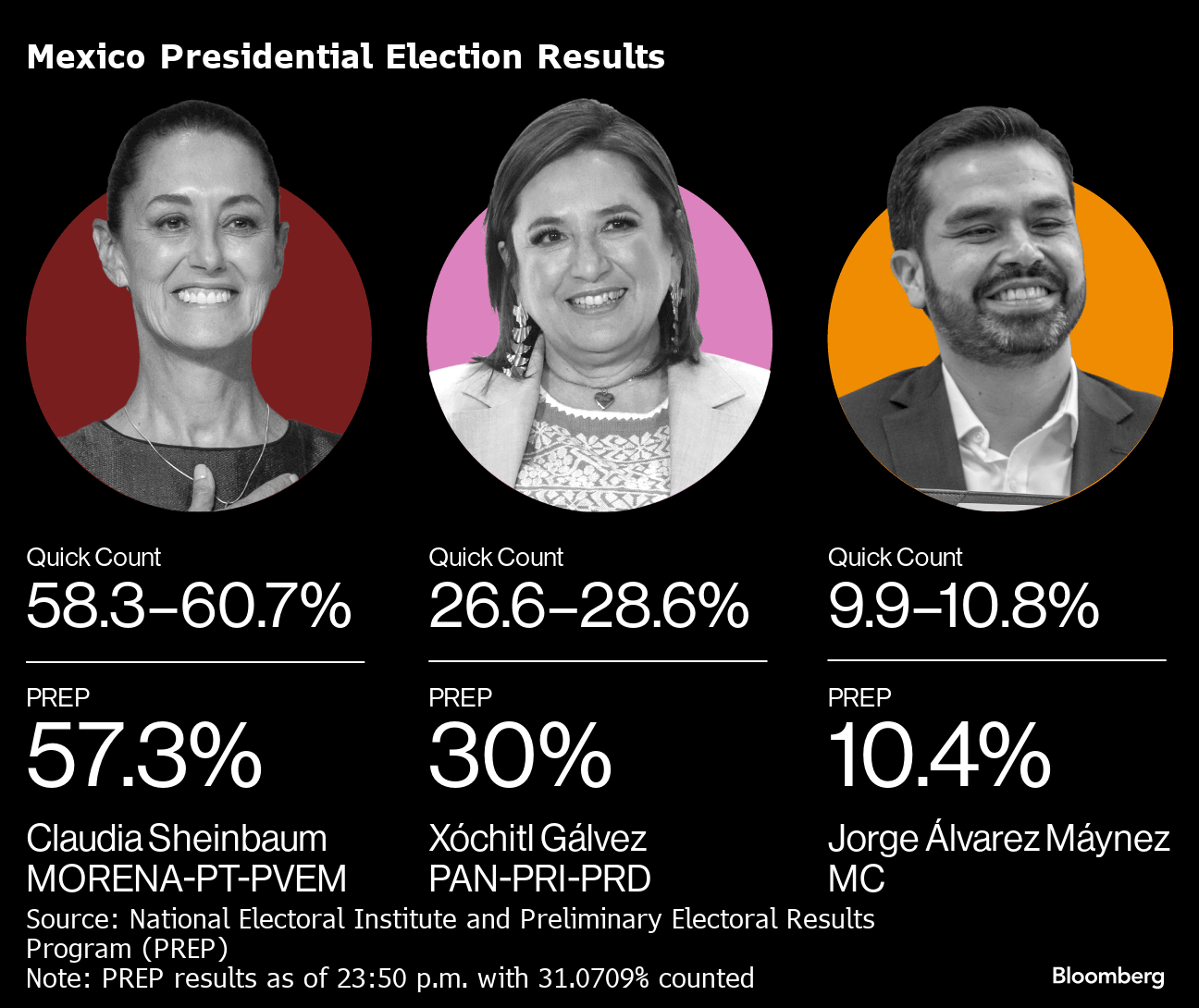 Předseda Národního volebního institutu uvedl, že Sheinbaumová má podle statistického vzorku 58,3 až 60,7 % hlasů. Opoziční kandidát Xóchitl Gálvez získal 26,6 až 28,6 % hlasů a Jorge Álvarez Máynez 9,9 až 10,8 % hlasů.