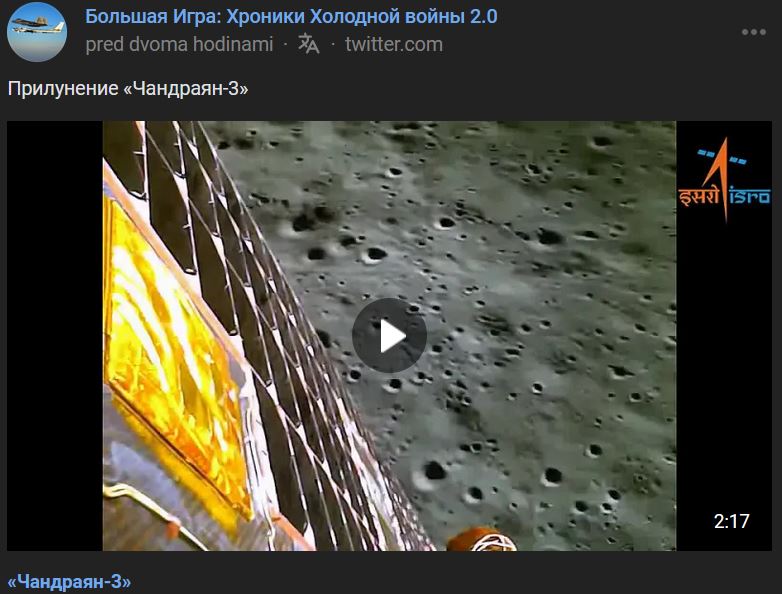 Pripomeňme, že on nie je vybavený rádioizotopovým ohrievačom, takže jeho nominálna životnosť je len jeden lunárny deň (14 pozemských dní). Inžinieri ISRO však dúfajú, že rover aj plošina prežijú noc a potom sa ich misia predĺži. Video https://vk.com/video-104764077_456279229 dĺžka 1:12 min.
