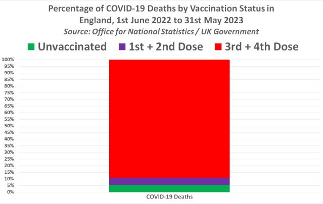 Úřad pro národní statistiku nedávno zveřejnil aktualizaci o úmrtích podle stavu očkování v Anglii a šokujícím způsobem odhalil, že očkovaná populace tvořila 95 % úmrtí na COVID-19 za 12 měsíců mezi 1. červnem 2022 a 31. květnem 2023 a 94 % z těchto úmrtí byla buď trojnásobně nebo čtyřnásobně očkovaná populace.