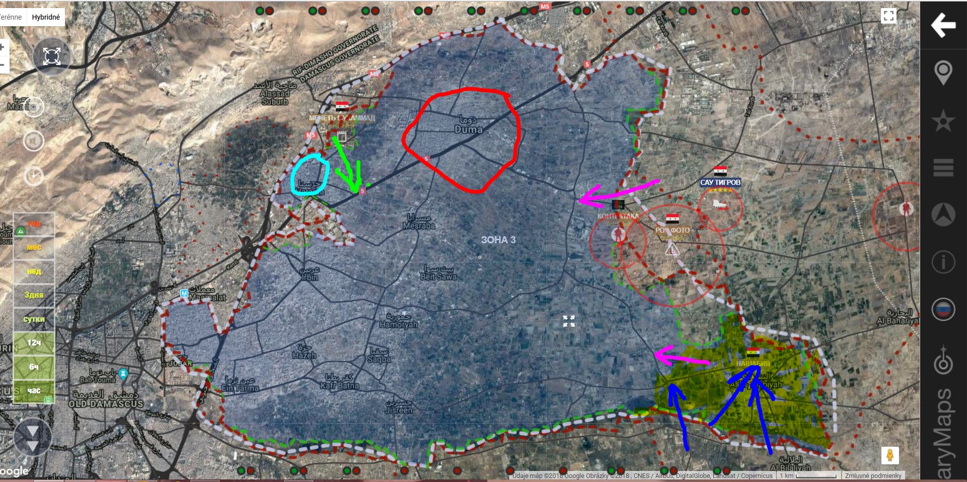 V. Ghouta. Tigri obsadili dôležitú cestnú križovatku, čím prerušili hlavné dodávateľské trasy rebelov - Shufuniyah - Beit Sawa - Autaya. Nie je jednoznačná situácia v priestore Našíbija. Podľa www.almasdarnews.com/article/latest-map ... -battle-3/ je v rukách SAA+, tak neviem!
