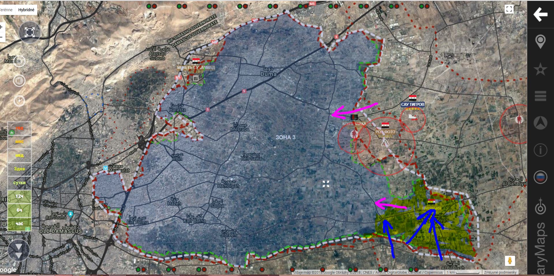 V. Ghouta. Tigri obsadili dôležitú cestnú križovatku, čím prerušili hlavné dodávateľské trasy rebelov - Shufuniyah - Beit Sawa - Autaya. Nie je jednoznačná situácia v priestore Našíbija. Podľa www.almasdarnews.com/article/latest-map ... -battle-3/ je v rukách SAA+, tak neviem!