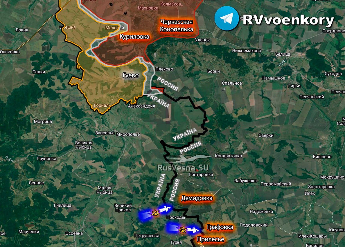 "Došlo k pokusu pěchoty ozbrojených sil Ukrajiny projít, ale nefungovalo to. V současné době aktivně pracuje dělostřelectvo. Nepřítel vytáhl dvě bojová vozidla IMR a 5 obrněných bojových vozidel v oblasti vesnice Maryino. Dvě nádrže jsou teď vynulované, pak hoříme. Hlavní pohyb je na křižovatce s Kurskem, poblíž osad Popovka a osad Demidovka,"