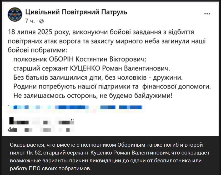 Zdroj https://vk.com/wall-123538639_4647984 z 20.07.2025Ukazuje sa, že spolu s plukovníkom Oborinom zahynul aj druhý pilot lietadla Jakovlev Jak-52 (Як-52), starší seržant Kucenko Roman Valentinovič (Куценко Роман Валентинович), čo znižuje možné varianty príčin na likvidáciu zadného cieľa BPLA alebo na prácu PPO svojich bratov.