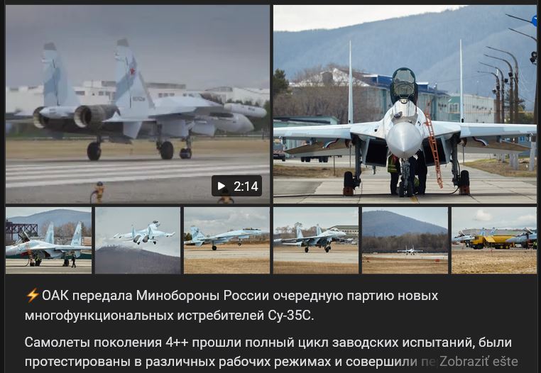 Video https://vk.com/video-211699782_456239688 dĺžka 1:29 min....Končiaci sa rok 2025 bol rekordný z hľadiska výroby bojových lietadiel. Plán výroby lietadiel Suchoj Su-35S bol splnený v plnom rozsahu, naši leteckí konštruktéri už pracujú na programe na budúci rok 2026. Suchoj Su-35S je jedným z najžiadanejších lietadiel v ozbrojených silách. Na jeho konte je najväčší počet zničených cieľov v priebehu ŠVO. Okrem toho účinne ničí nepriateľa na rekordné vzdialenosti – niekoľko sto kilometrov...