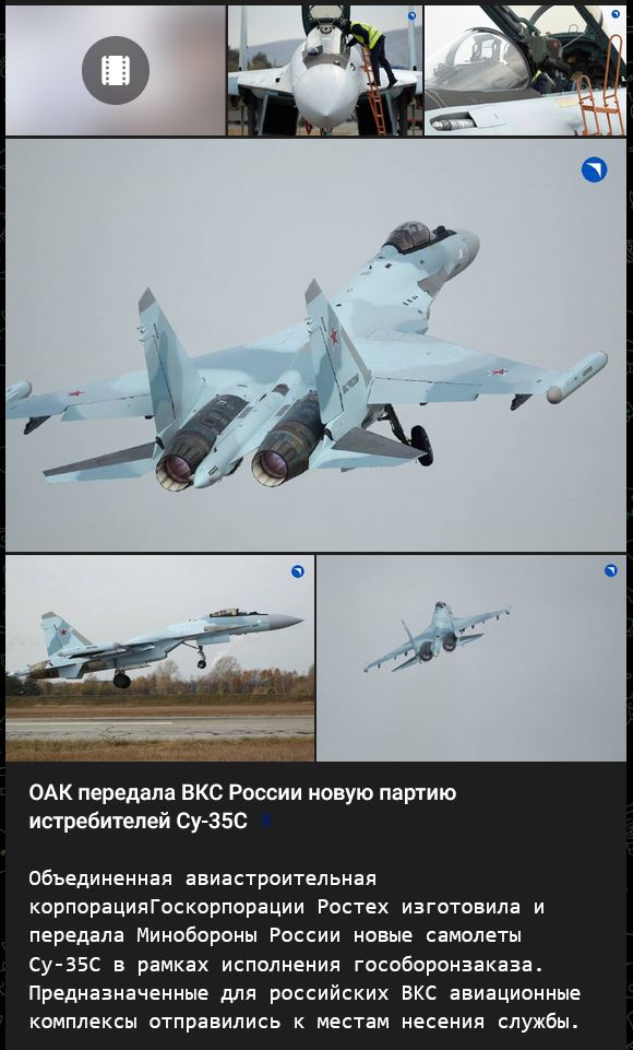 Video https://vk.com/video-211699782_456239656 dĺžka 2:40 min.... Leteckí konštruktéri štátnej korporácie Rostech výrazne zvýšili tempo dodávok moderných bojových lietadiel v záujme Ministerstva obrany RF. To sa týka aj lietadiel Suchoj Su-35S – v súčasnosti najúčinnejšieho moderného lietadla na svete. Na konte týchto strojov je množstvo zničených vzdušných cieľov nepriateľa ...
