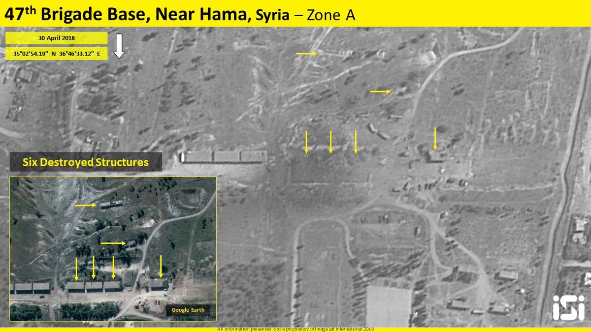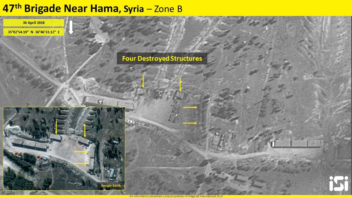 Satelitních snímků základny 47. brigády v oblasti Hama, kde explodoval muniční sklad