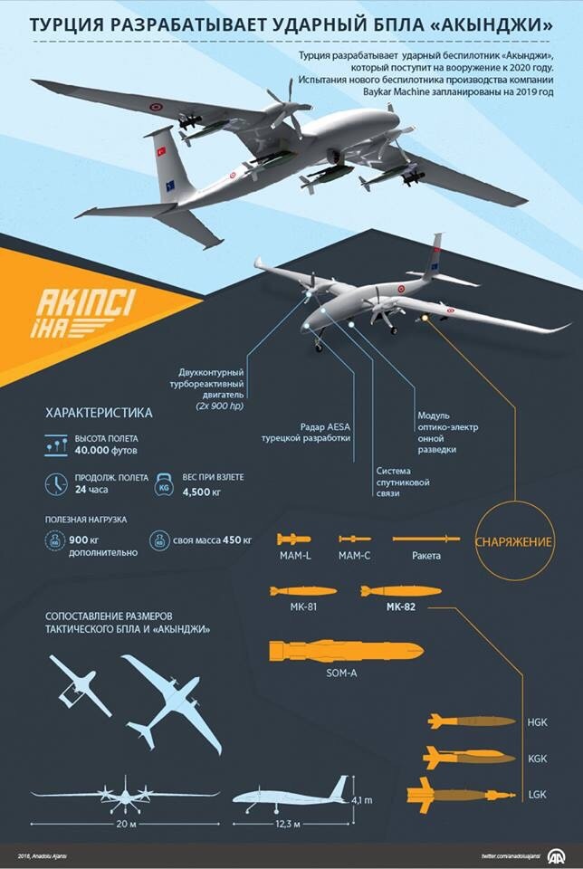 Turecko vyvíjí těžký dron s operační výškou až 12000m, s hmotností nákladu na vnějším zavěšení 900 kg a uvnitř trupu 450 kg, odhadovaný začátek výroby 2021.