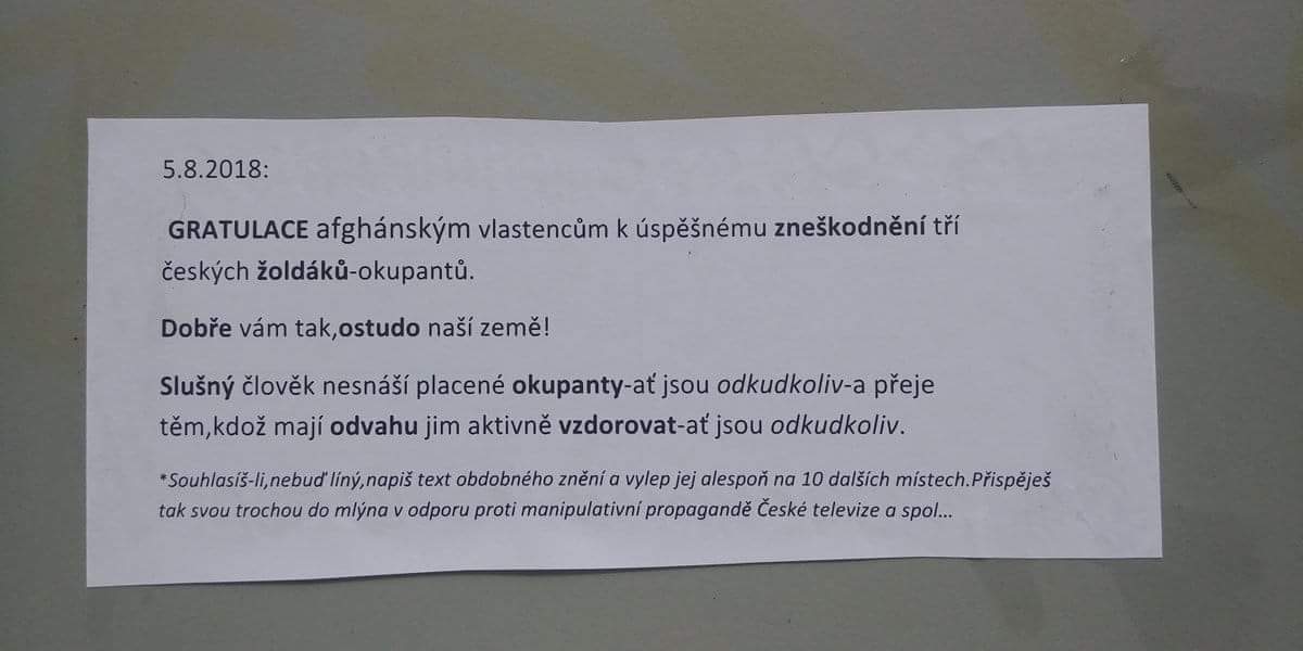 v Praze se objevily dĕkovné letáky považující mrtvé české vojáky za okupanty. Policie zahájila šetření zda se nejedná o podporu terorismu