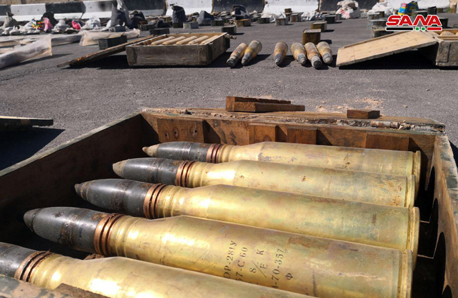 Reportér SANA povedal, že úrady v stredu našli zbrane, muníciu a náboje, ktoré zanechali teroristické skupiny, v Damašku vo východnej Ghoute, niektoré vyrobené v USA.