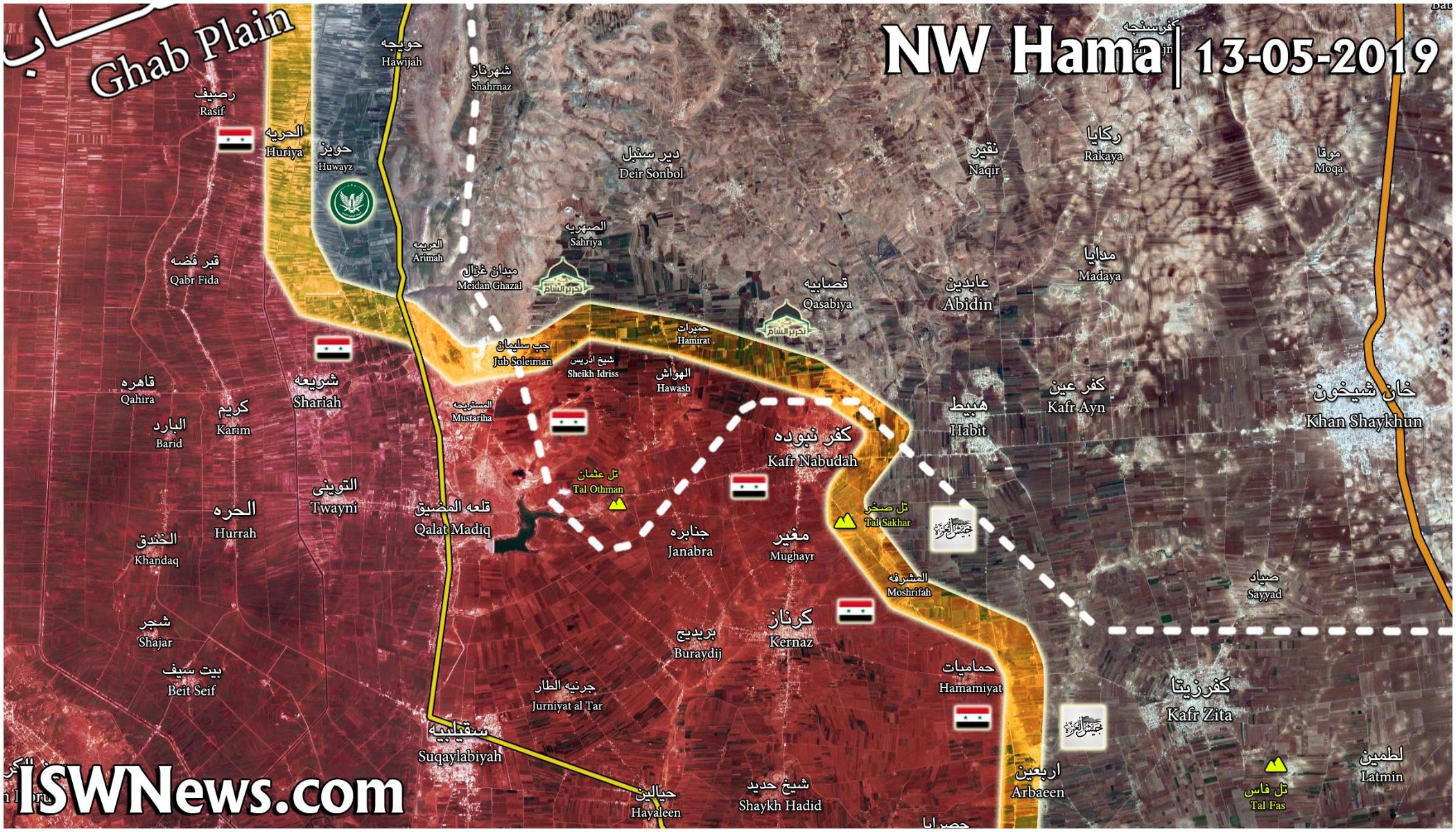 13. mája zahájili Hayat Tahrir al-Sham a jeho Tureckom podporovaní spojenci rozsiahly protiútok proti postupujúcim silám sýrskej arabskej armády v severozápadnej Hame. Militanti nasadili veľké množstvo pechoty podporované aspoň 4 tankami a niekoľkými ďalšími obrnenými vozidlami. Podľa počiatočných správ, sily pod vedením Hayata Tahrira al-Shama zabili 10 vojakov SAA+ a vstúpili do dedín Hamamiat a Kafr Nabudah. Nedokázali však rozvinúť svoj počiatočný úspech. SAA, podporená sýrskymi a ruskými lietadlami, sa zoskupila a začala ich tlačiť späť na predchádzajúce pozície. 14. mája, po sérii intenzívnych stretov, militanti ustúpili.