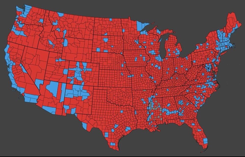 Červená barva na mapě tradičně představuje republikánské okresy, zatímco modrá symbolizuje demokratické. Tento typ mapy je často používán k ilustraci geografického rozložení politických preferencí. Muskovým sdílením této mapy, která ukazuje Spojené státy s převažující červenou barvou, by mohl naznačovat názor, že většina území USA podporuje konzervativnější, republikánské hodnoty a přístupy k vládě. Přestože taková mapa vizuálně zvýrazňuje dominantní postavení republikánů na venkově, je nutné si uvědomit, že geografické pokrytí nemusí vždy odpovídat celkové podpoře. V hustě obydlených městských oblastech, které jsou zde zobrazeny jako modré body, žije totiž podstatná část americké populace.