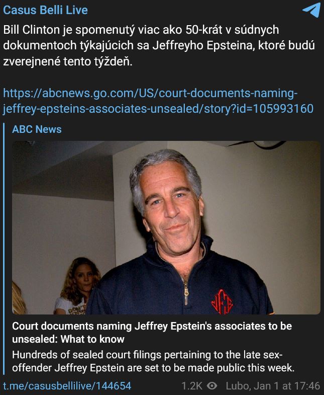 Bill Clinton je spomenutý viac ako 50-krát v súdnych dokumentoch týkajúcich sa Jeffreyho Epsteina, ktoré budú zverejnené tento týždeň.