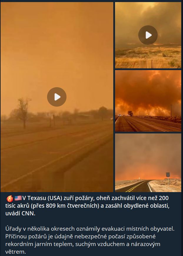 V Texasu (USA) zuří požáry, oheň zachvátil více než 200 tisíc akrů (přes 809 km čtverečních) a zasáhl obydlené oblasti, uvádí CNN. Úřady v několika okresech oznámily evakuaci místních obyvatel. Příčinou požárů je údajně nebezpečné počasí způsobené rekordním jarním teplem, suchým vzduchem a nárazovým větrem.