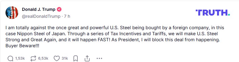 napsal Trump na své platformě Truth Social. "Prostřednictvím řady daňových pobídek a tarifů učiníme americkou ocel opět silnou a skvělou, a stane se to RYCHLE! Jako prezident zablokuji uskutečnění této dohody. Kupující pozor!!" Prohlášení nově zvoleného prezidenta přichází v době, kdy Nippon Steel, největší japonský výrobce oceli a čtvrtý největší producent na světě, závodí o dokončení akvizice do konce roku.