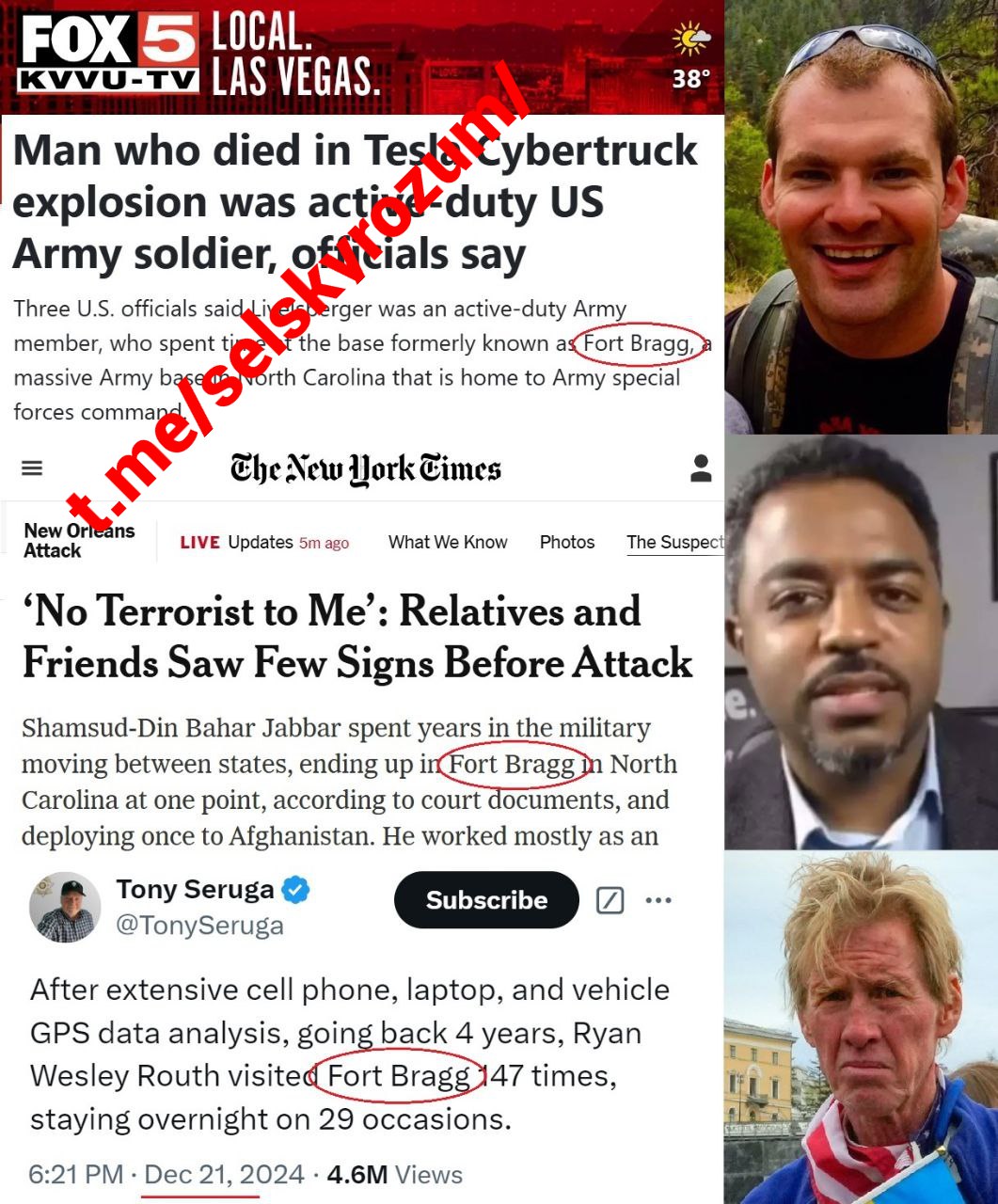 Podivnou shodou okolností sloužili terorista, který vyhodil do vzduchu Teslu v Las Vegas, a terorista, který přejel lidi v New Orleans, na stejné vojenské základně Fort Bragg v Severní Karolíně, kde jsou umístěny speciální jednotky americké armády. Ryan Routh, který se koncem loňského roku pokusil o atentát na Donalda Trumpa, byl na stejné základně častým hostem (147krát).