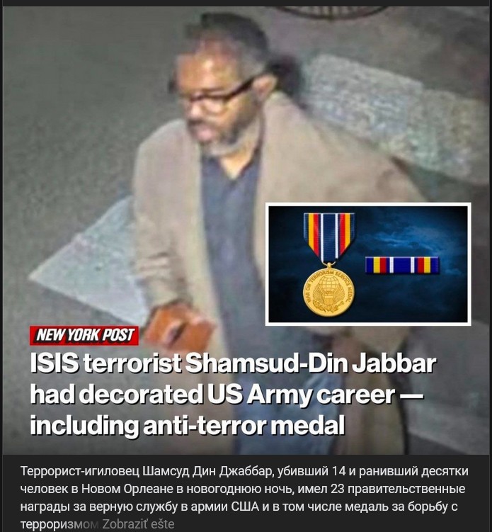 Terorista ISIS Šamsud Din Džabbar, ktorý na Silvestra 31.12.2024 v New Orleans zabil 14 ľudí a desiatky zranil, mal 23 vládnych vyznamenaní za vernú službu v armáde SŠA, vrátane protiteroristickej medaily.