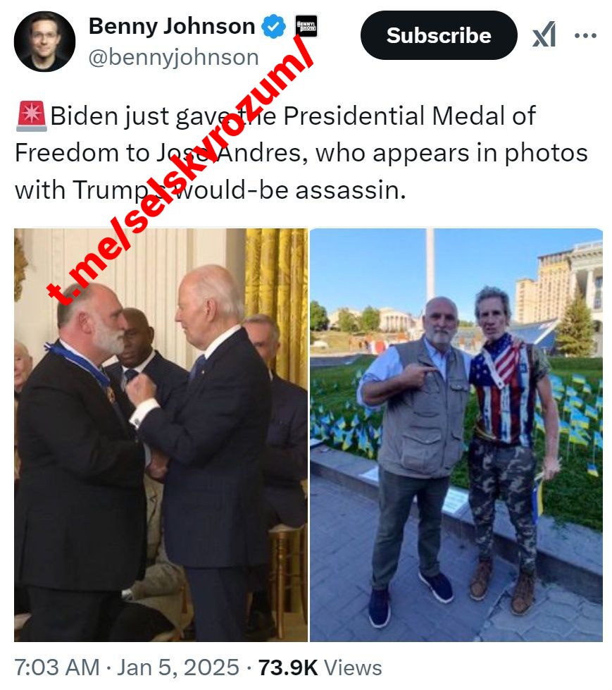 Biden také předal Medaili svobody prominentnímu restauratérovi a protitrumpovskému aktivistovi Josému Andresovi, který předtím pózoval na fotografii s proukrajinským aktivistou Ryanem Rootem, který se pokusil o atentát na Trumpa.