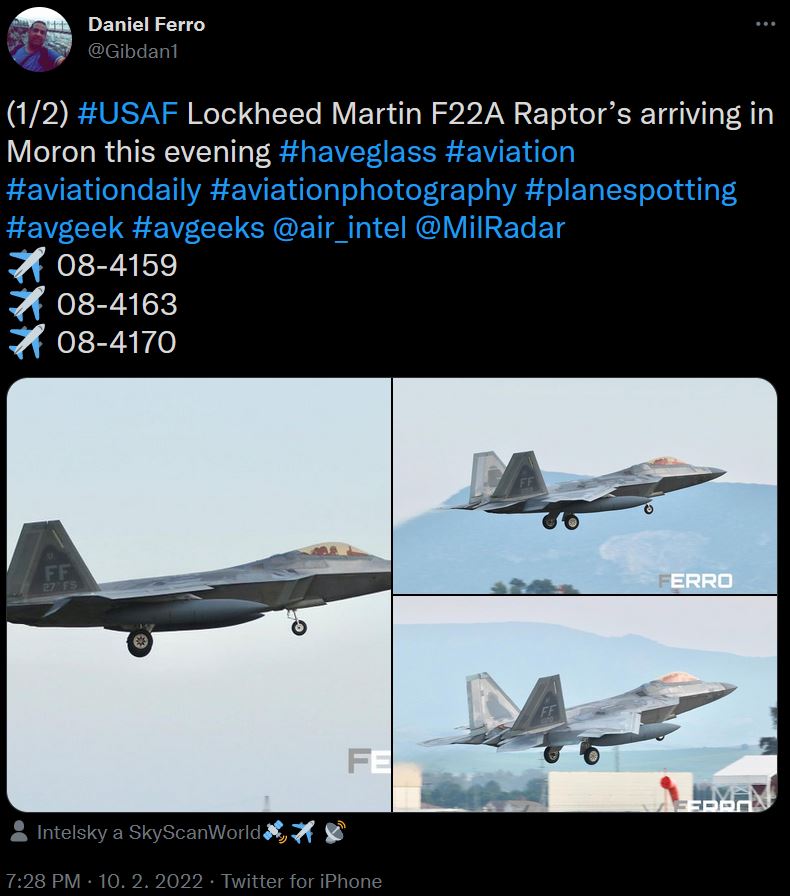 Štvrtok 10.02.2022, letecká základňa Morón Air Base, pristátie 6 lietadiel F-22A od USAF (08-4159, 08-4163, 08-4170, 09-4172, 09-4176, 09-4178)