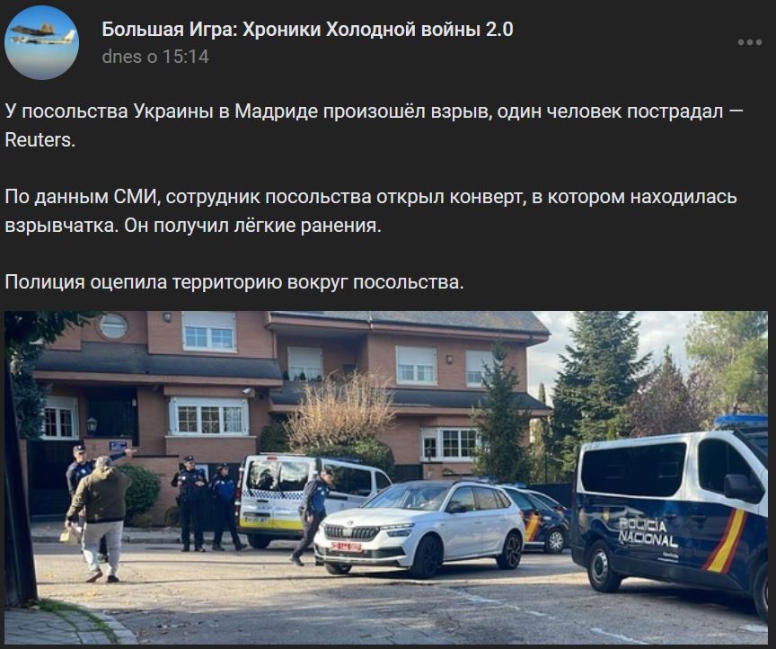 V okolí Ukrajinského veľvyslanectva v Madride došlo k výbuchu, pri ktorom utrpela zranenia jedna osoba. Podľa správ médií zamestnanec veľvyslanectva otvoril obálku obsahujúcu výbušniny. Utrpel ľahké zranenia. Polícia uzavrela okolie veľvyslanectva.