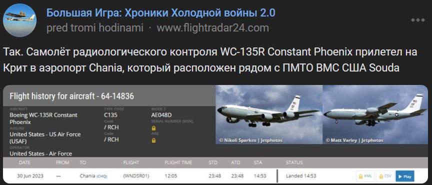 Tak. Lietadlo radiačnej kontroly WC-135R Constant Phoenix v piatok 30.06.2023 priletelo na Krétu na letisko Chania, ktoré sa nachádza vedľa PMTO VMS (námorná základňa) SŠA Souda