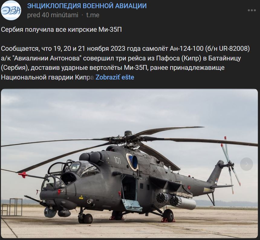 Uvádza sa, že v nedeľu 19.11. + pondelok 20.11. a utorok 21.11.2023 uskutočnilo lietadlo Antonov An-124-100 (Ан-124-100) (trupové označenie UR-82008) spoločnosti Antonov 3 lety z Pafosu (Cyprus) do Batajnice (Srbsko), pričom doručilo bojové vrtuľníky Mi-35P (Ми-35П), ktoré predtým vlastnila Cyperská národná garda. Uvádza sa, že tieto 3 lety prepravili do Srbska všetkých 11 vrtuľníkov. V roku 2022 sa Cyprus rozhodol odmietnuť ďalšiu prevádzku ruských vrtuľníkov Mi-35. V 06/2022 cyperská vláda podpísala zmluvu so spoločnosťou Airbus Helicopters o nákupe 6 vrtuľníkov H145M, ktoré majú nahradiť Mi-35. Srbsko prejavilo záujem o cyperské Mi-35.