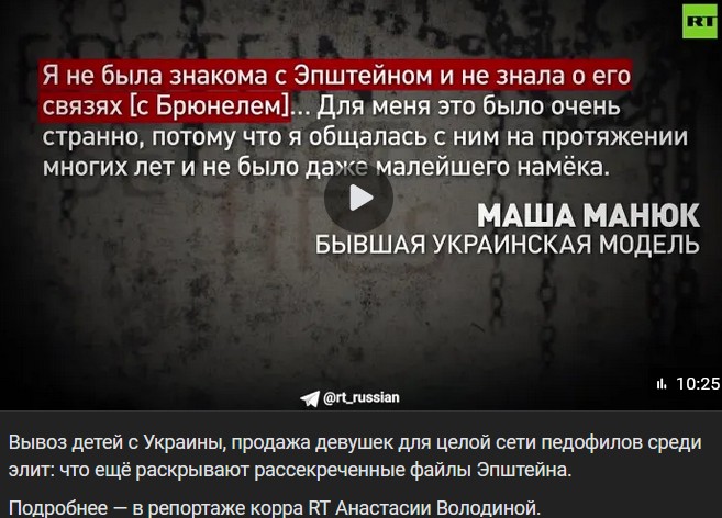 Video https://vkvideo.ru/video-104764077_456292307 dĺžka 10:25 min.Vyvážanie detí z Ukrajiny, predaj dievčat pre celú sieť pedofilov medzi elitou: čo ešte odhaľujú odtajnené súbory Epsteina.