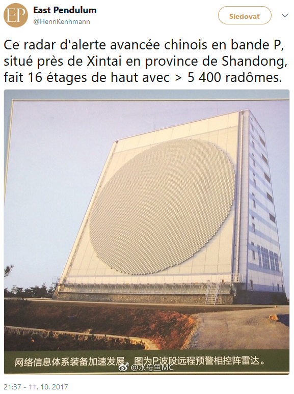 Radar: Výška ako 16 poschodová budova, radarové pole osadené viac ako 5400 prvkami, je to pri meste Xintai