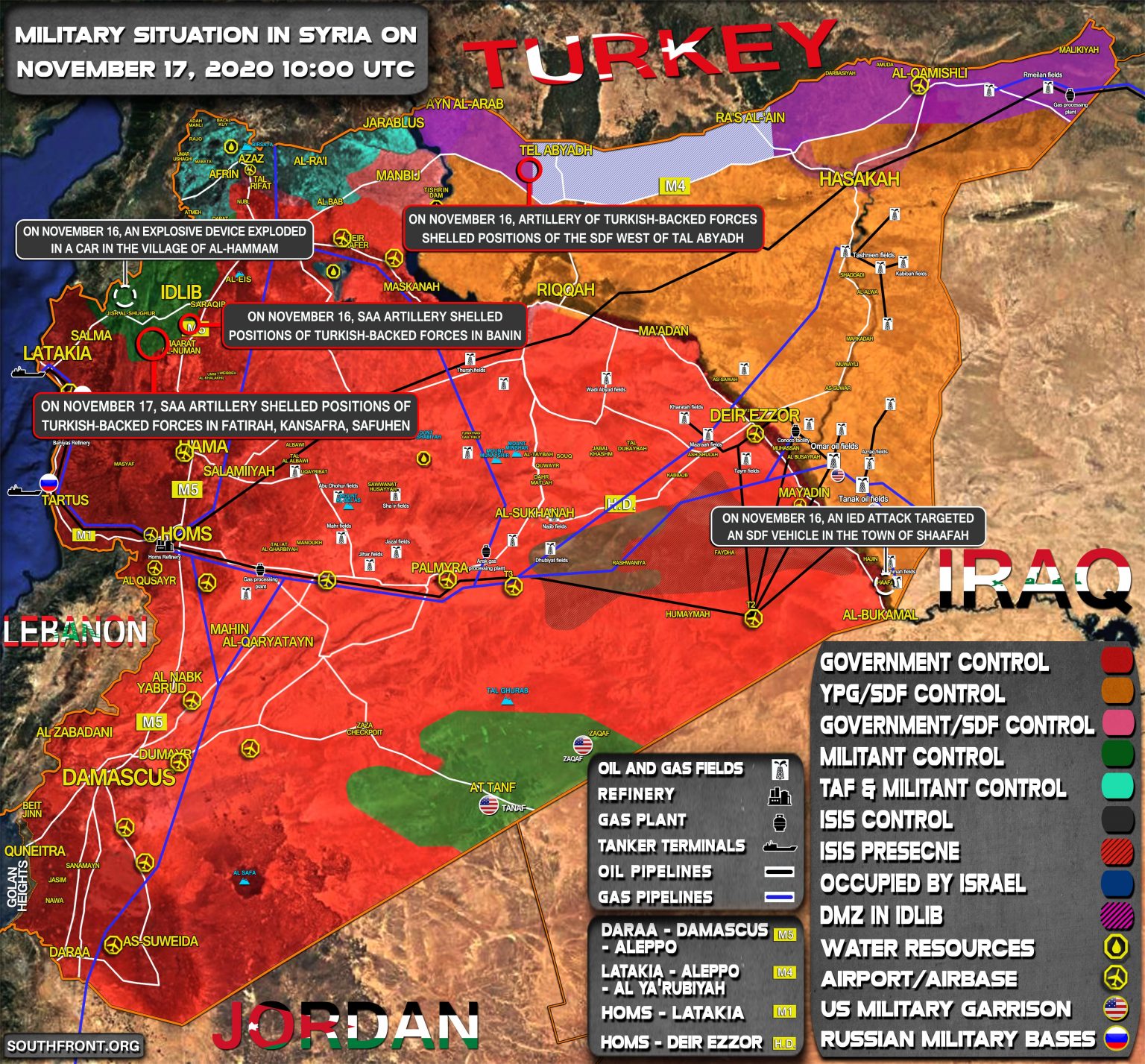16. novembra bol útok IED zameraný na vozidlo sýrskych demokratických síl (SDF) v meste Shaafah;