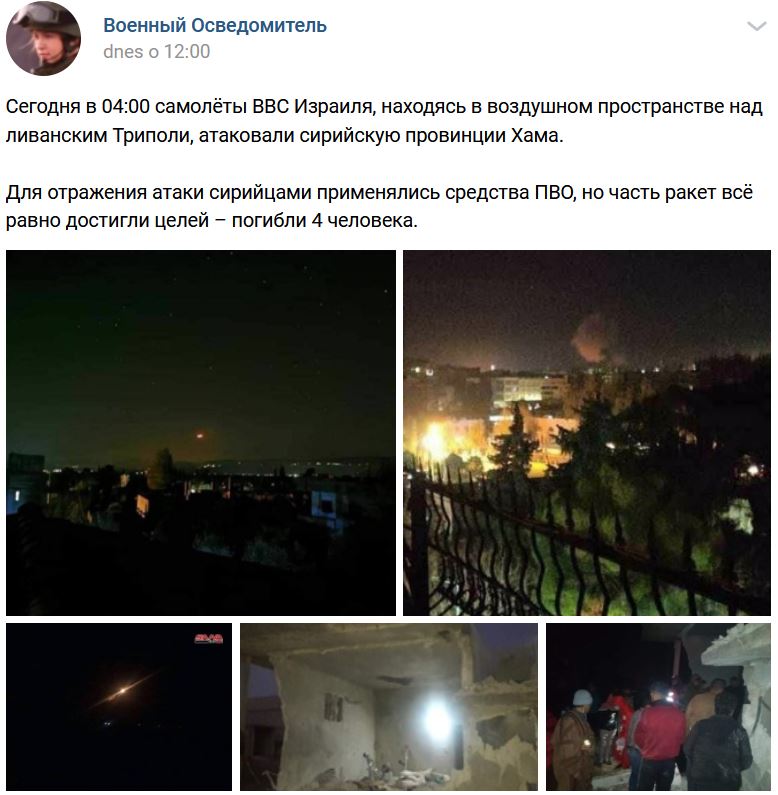 Sýrska tlačová agentúra (SANA) informovala o izraelských náletoch pochádzajúcich zo smeru od libanonského mesta Tripolis proti miestam v gubernáte Hamá nad ránom. Žiadne podrobnosti o tom, čo bolo napadnuté nezverejnila