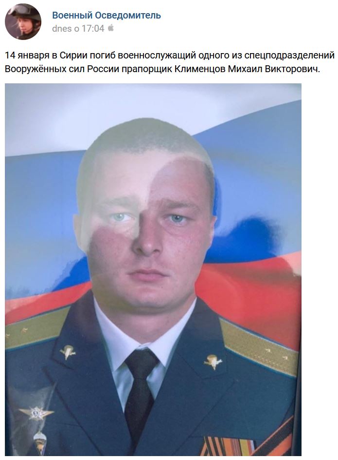 Vo štvrtok 14.01.2021 v Sýrii zahynul príslušník jedného z oddielov Specnaz práporčík Michail Viktorovič Klimencov (Михаил Викторович Клименцов)